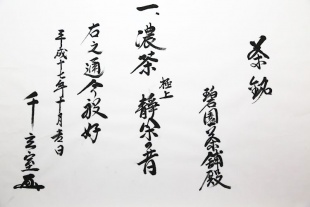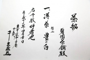 茶銘 豊田市で唯一、家元から「銘」を拝受し、お茶会などで使われています。 『静閑の昔』 - 裏千家今日庵鵬雲斎大宗御好 「静閑の昔」は抹茶特有の、まろやかな旨みとふくよかな香りを濃く持ち合せた極上のお抹茶です。最初のまったりとした甘みが後口まで残ります。お濃茶にお勧めです。 『豊の白』 - 裏千家今日庵鵬雲斎大宗御好 「豊の白」はさっぱりとした甘みが特徴。渋みが控えめなので、お抹茶を飲みなれていない方にもおすすめです。薄茶でお召し上がりください。