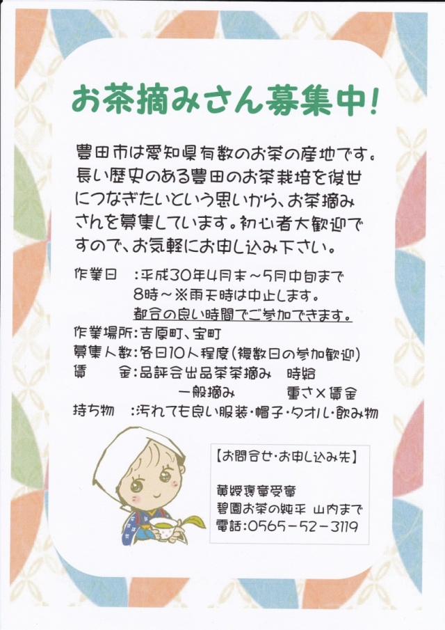 2018年04月02日(月) お茶摘みさん募集中 お茶の新芽もスクスクと順調に育っています。 今年はお茶摘みが例年に比べ少し早くなりそうです。 新茶時期に備え少し速足で準備を進めています。 碧園お茶の純平では、一緒にお茶摘みをしていただける方を募集しています ご興味がある方は、右の「摘み子さん大募集」のボタンをクリックしていただきお申し付けください。 お電話でもご応募できます。 沢山のご応募をお待ちしております。