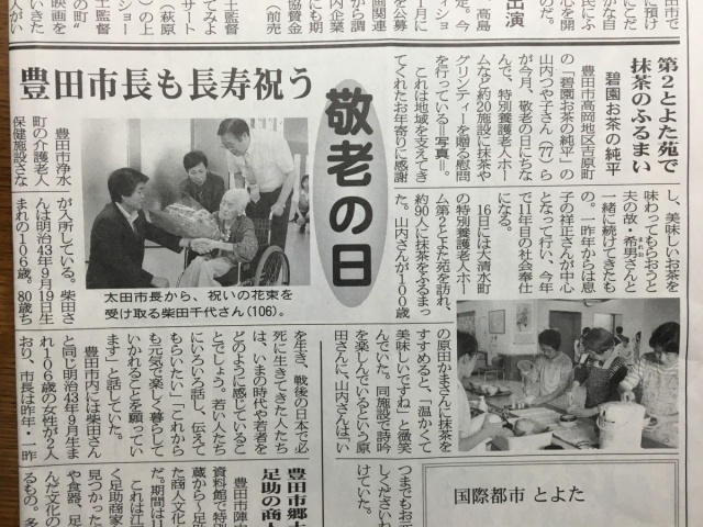 2016年09月27日(火) イベント < ニュース&イベント&掲載情報 敬老の日 敬老の日 碧園お茶の純平では感謝の日です 弊社、4代目が始め今に至っています活動、今年で11年目 豊田市市域の施設に故郷のお茶を楽しんで頂きます 今年は約20施設で故郷のお茶を楽しんで頂きました
