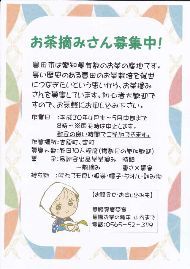 2018年04月02日(月) イベント < ニュース&イベント&掲載情報 お茶摘みさん募集中 お茶の新芽も順調にスクスク育っています。 今年のお茶摘みは少し早くなりそうです。 碧園お茶の純平では、一緒にお茶摘みをして頂ける方を募集しています!! お電話か右側の「お茶摘みさん大募集」のボタンからご応募下さい。 沢山のお問合せお待ちしております!!