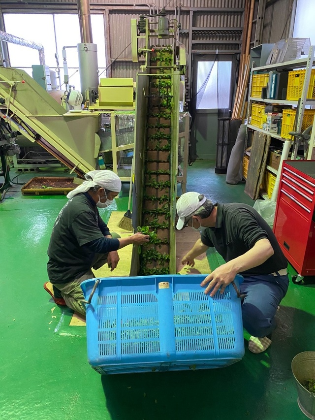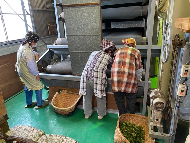 2021年05月25日(火) イベント < ニュース&イベント&掲載情報 お茶工場も最盛期です 5月5日から始まったお茶製造も最盛期を迎えています。 碾茶製造の工程は茶葉を蒸して乾かす。 単純に見えるようで奥が深く、常に変わる気温湿度を見 ながら蒸しや火炉の温度等を微調整して常に気が抜けま せん。非常にデリケートなお茶づくりです。 機械化が進む中、人の手はかかせません。 工場内は、碾茶特有の甘い香りに包まれます。 工場内は、常に35℃~40℃になります。 暑い中、共に作業して頂ける事に感謝申し上げます。