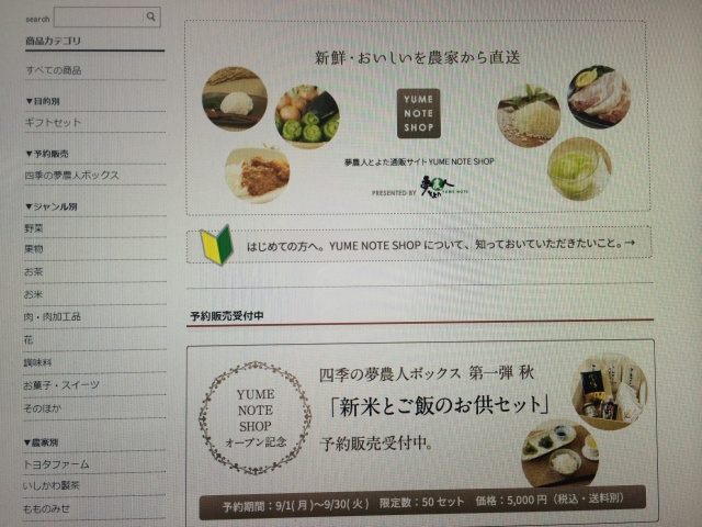 2014年09月02日(火) ニュース < ニュース&イベント&掲載情報 ネットショップオープンしました。 夢農人のネットショップが9月1日オープンしました。 プロ農家の丹精込めた農産物がいつでもお取り寄せできます。 詳しくはこちらから⇒夢農人ネットショップ