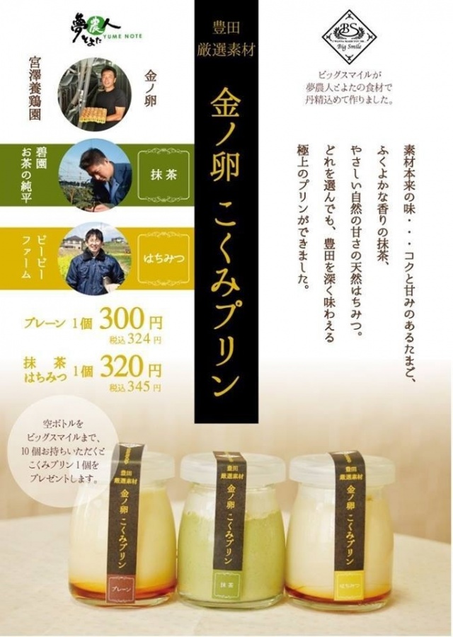 2014年10月13日(月) ニュース < ニュース&イベント&掲載情報 金の卵 こくみプリン発売しました。 豊田市で有名な洋食屋 BigSmileさんと夢農人のコラボ商品 【金ノ卵 こくみプリン】 宮澤養鶏園さんの 極上金ノ卵 ビービーファームさんの はちみつ そして、碧園お茶の純平の高品質抹茶が くりなす素敵なハーモニーが楽しめます。 豊田市のスーパー【やまのぶ】さんで先行販売です。 夢農人HP やまのぶHP