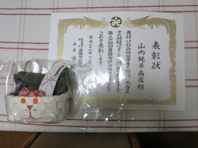 2014年11月12日(水) ニュース < ニュース&イベント&掲載情報 第34回豊田市社会福祉大会で表彰されました 11月8日に開催された「第34回豊田市社会福祉大会」にて弊社が豊田市社会福祉協議会長賞を受賞いたしました。 敬老の日の施設の訪問や長年の社会貢献活動を対しての評価を頂けたものと、従業員一同、大変喜んでいます。今後も、地域の皆様に喜んでいただける会社になるべく、従業員と力を合わせ頑張っていきたいと思います。
