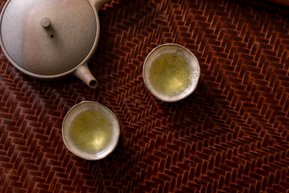 - 最後に、急須から茶碗に玉露を注ぎます。茶碗に抹茶が底に残らないように注意して注ぎます。